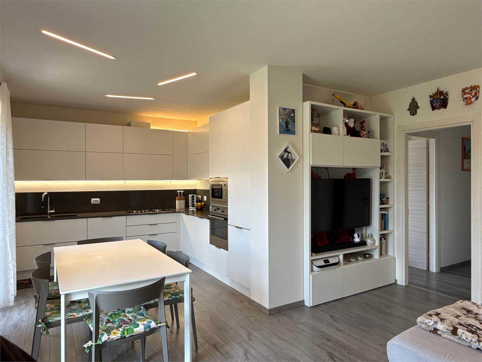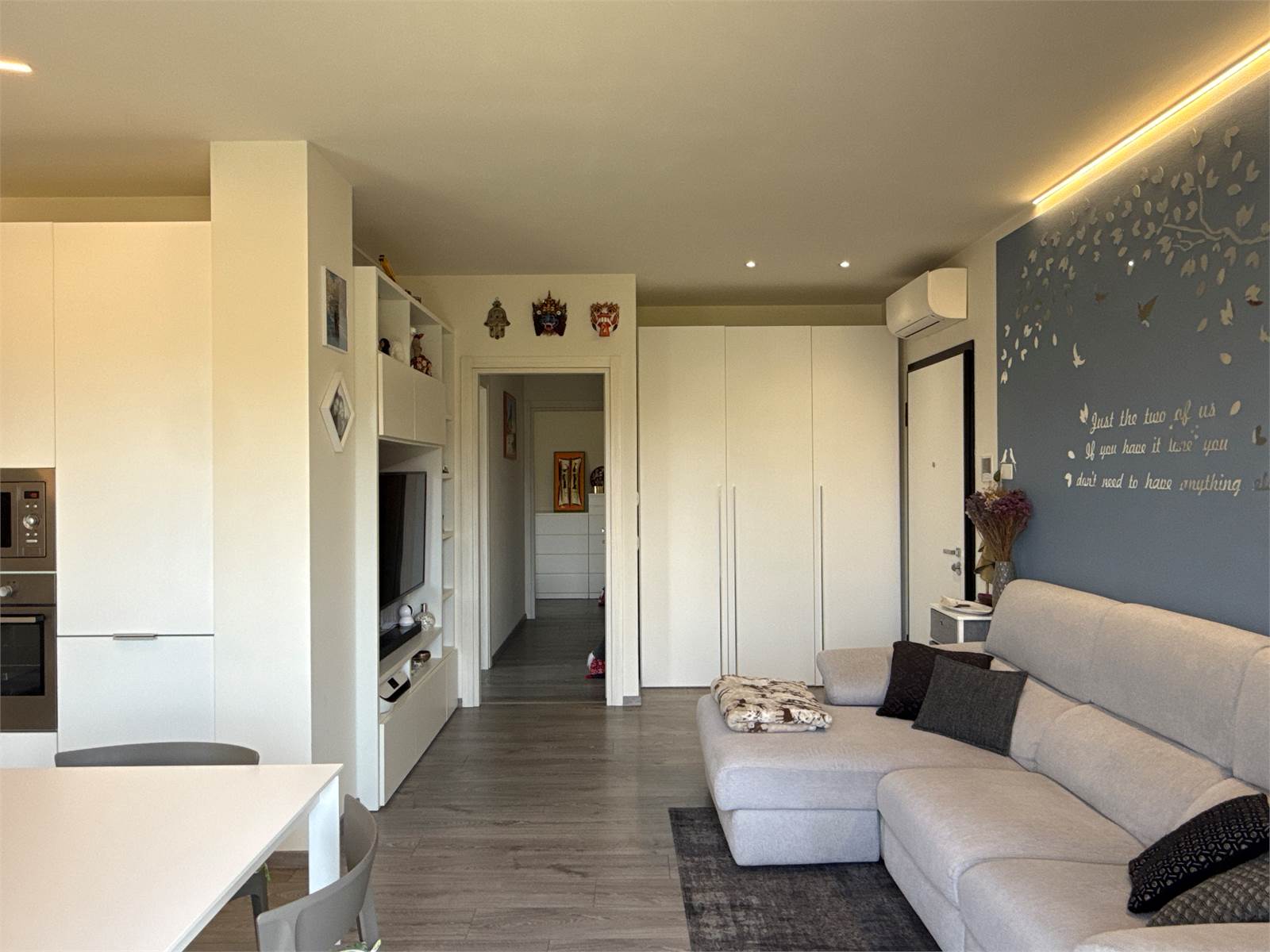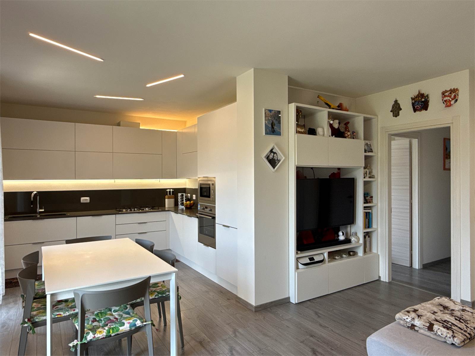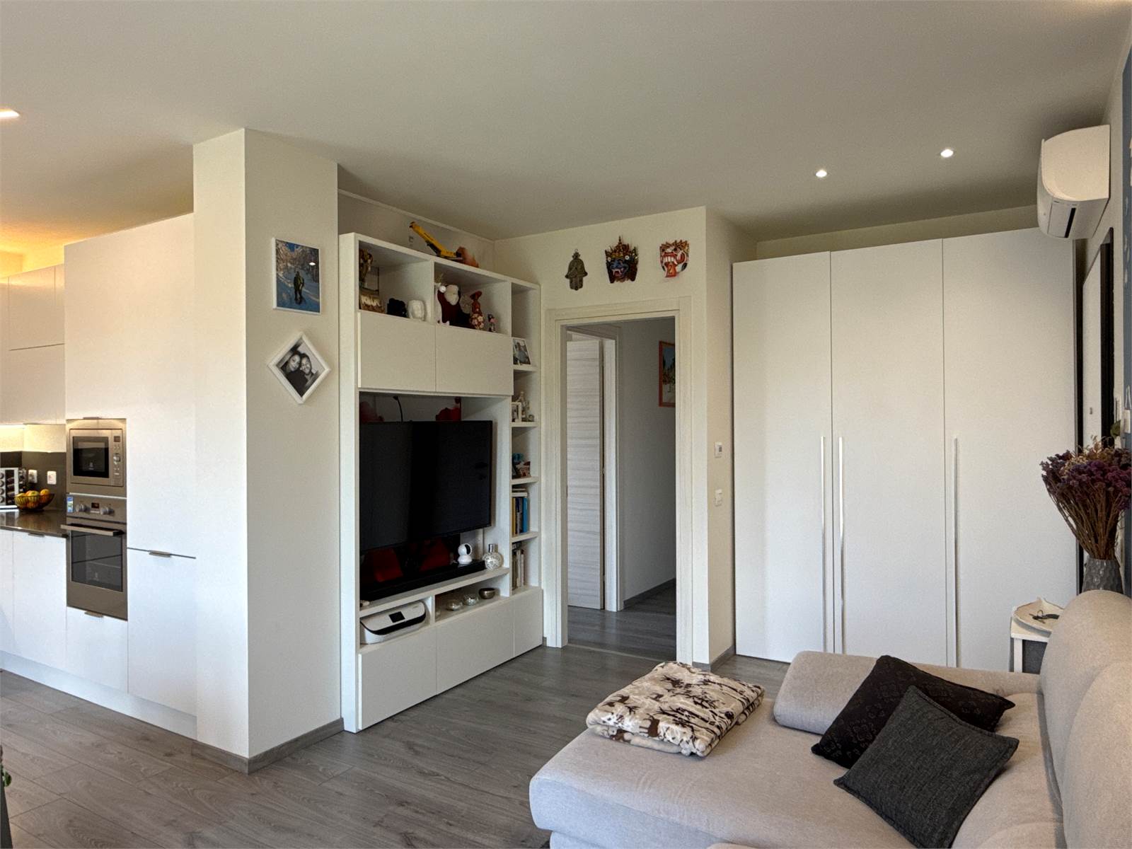 L’ingresso si apre su una luminosa zona giorno open space, accogliente e moderna, con ampio soggiorno e cucina a vista. La cucina, completa di tavolo e sedie, è compresa nel prezzo di vendita.