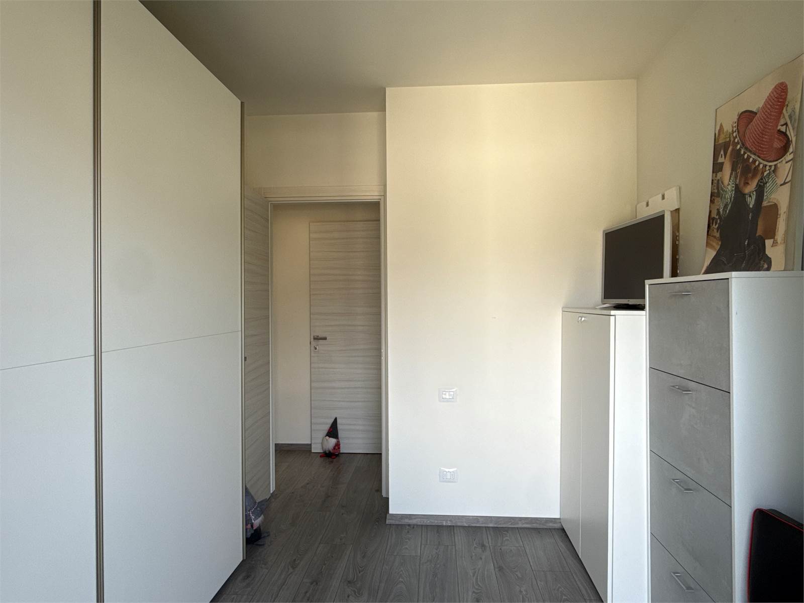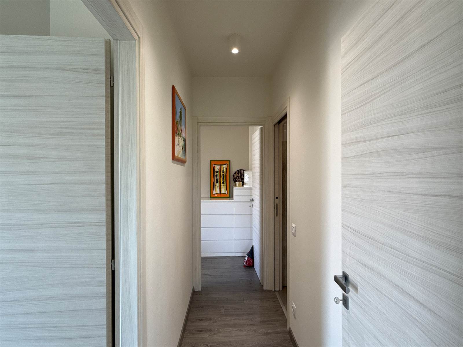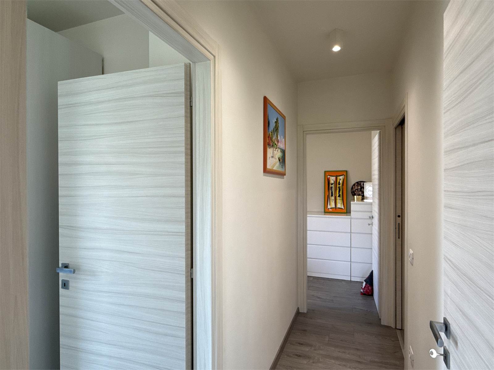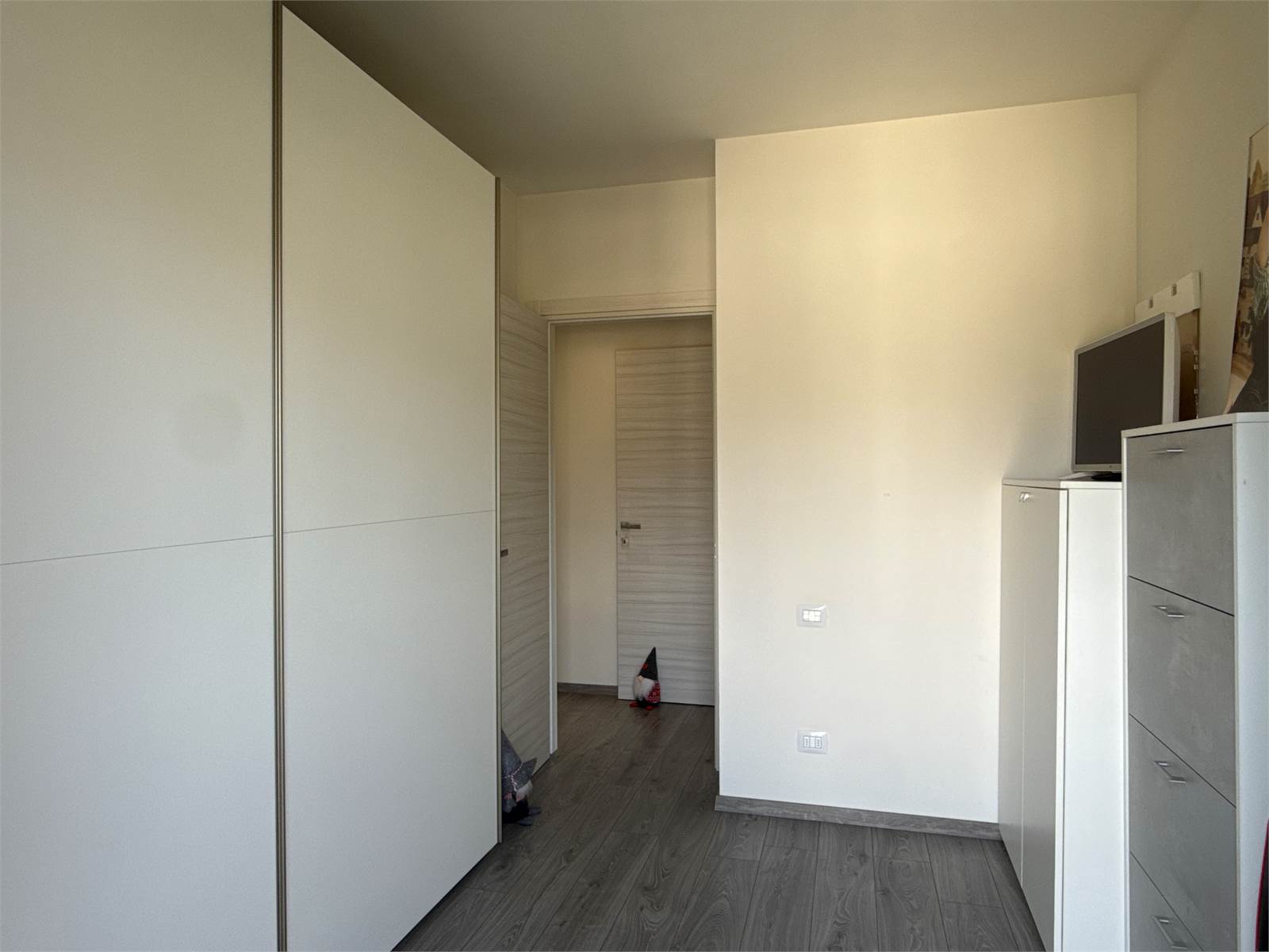 Un corridoio accompagna alla zona notte, dove troviamo una cameretta con accesso a un secondo terrazzo, comunicante anche con la camera matrimoniale. Completano l’abitazione un ampio bagno con doccia e una comoda zona lavanderia separata, elemento sempre più ricercato e particolarmente pratico.