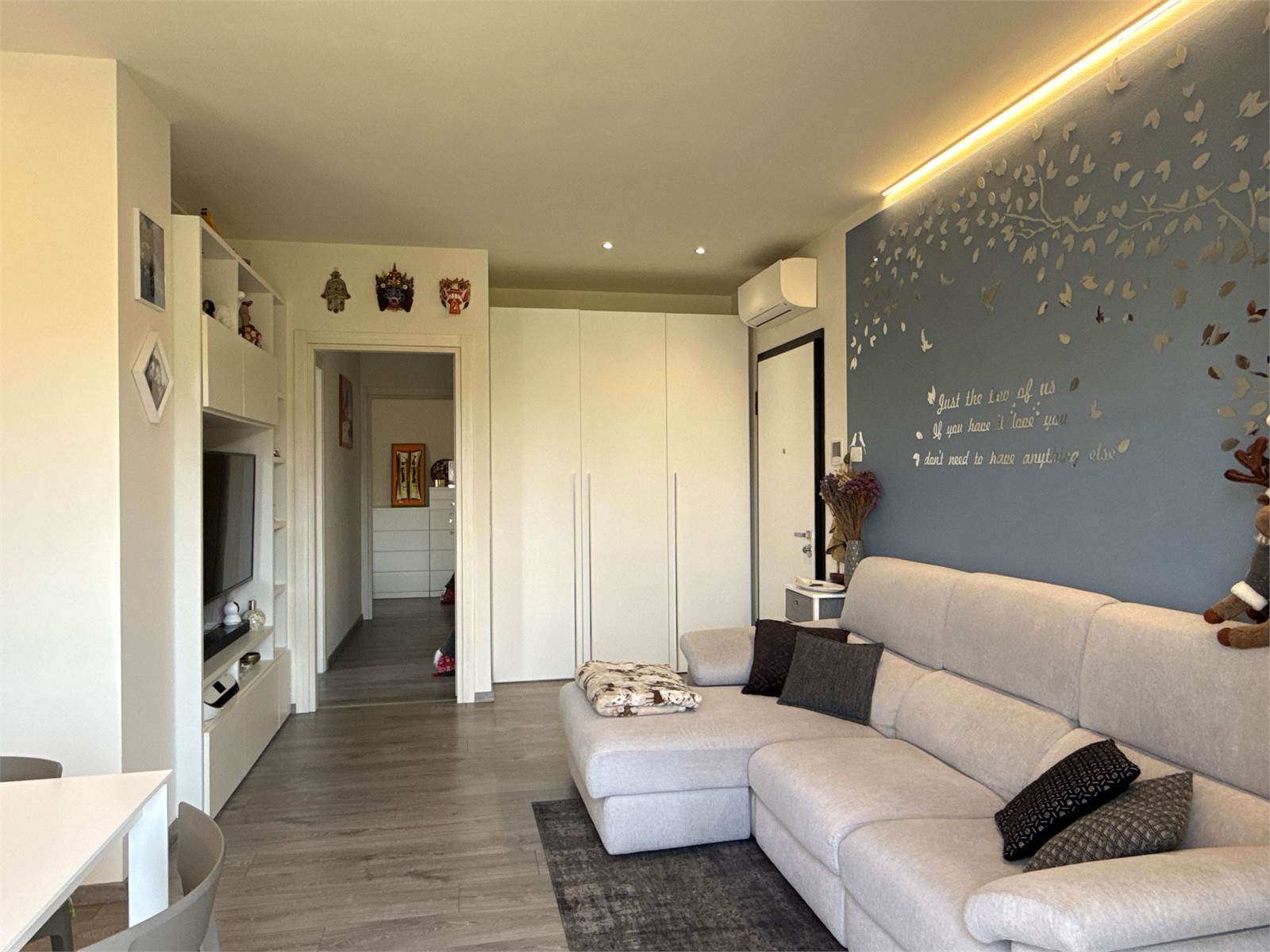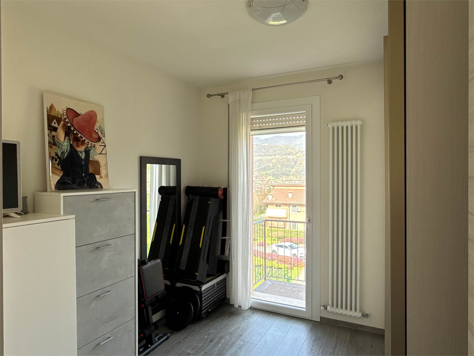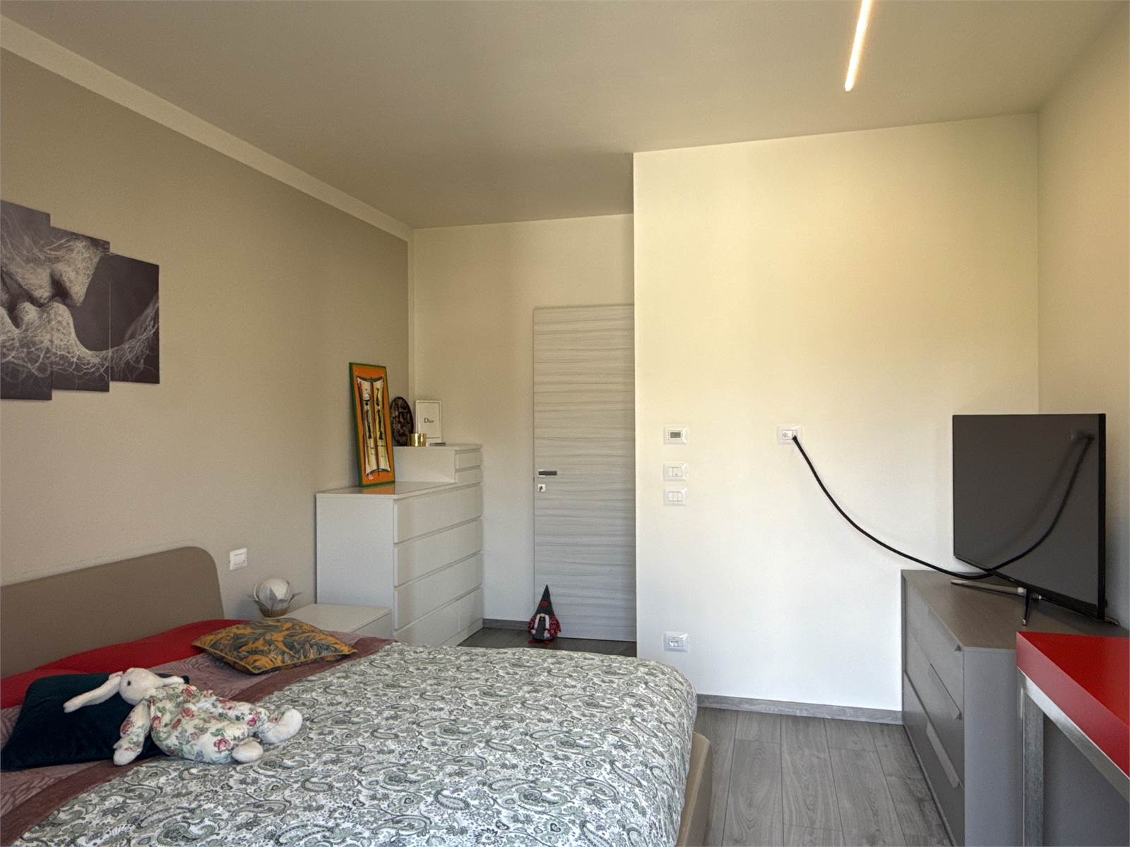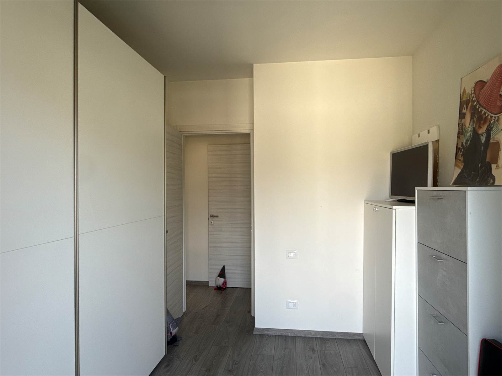 Un corridoio accompagna alla zona notte, dove troviamo una cameretta con accesso a un secondo terrazzo, comunicante anche con la camera matrimoniale. Completano l’abitazione un ampio bagno con doccia e una comoda zona lavanderia separata, elemento sempre più ricercato e particolarmente pratico.