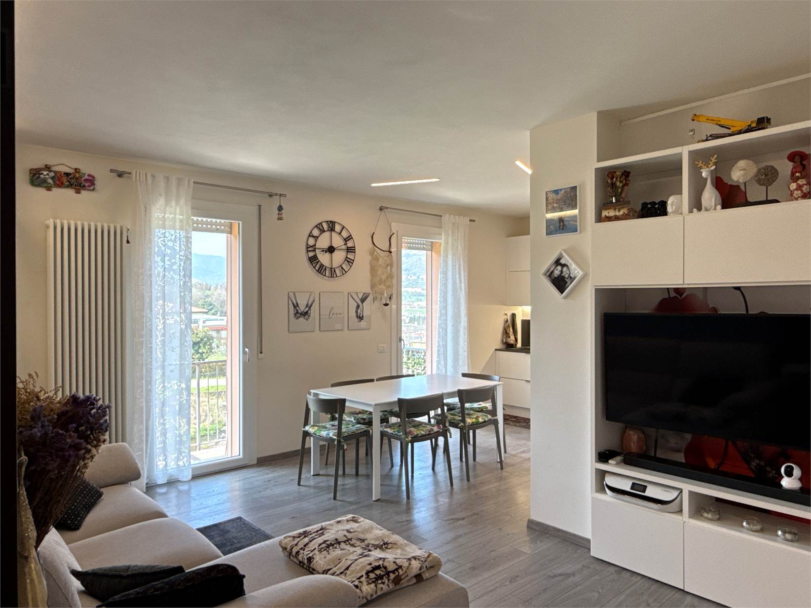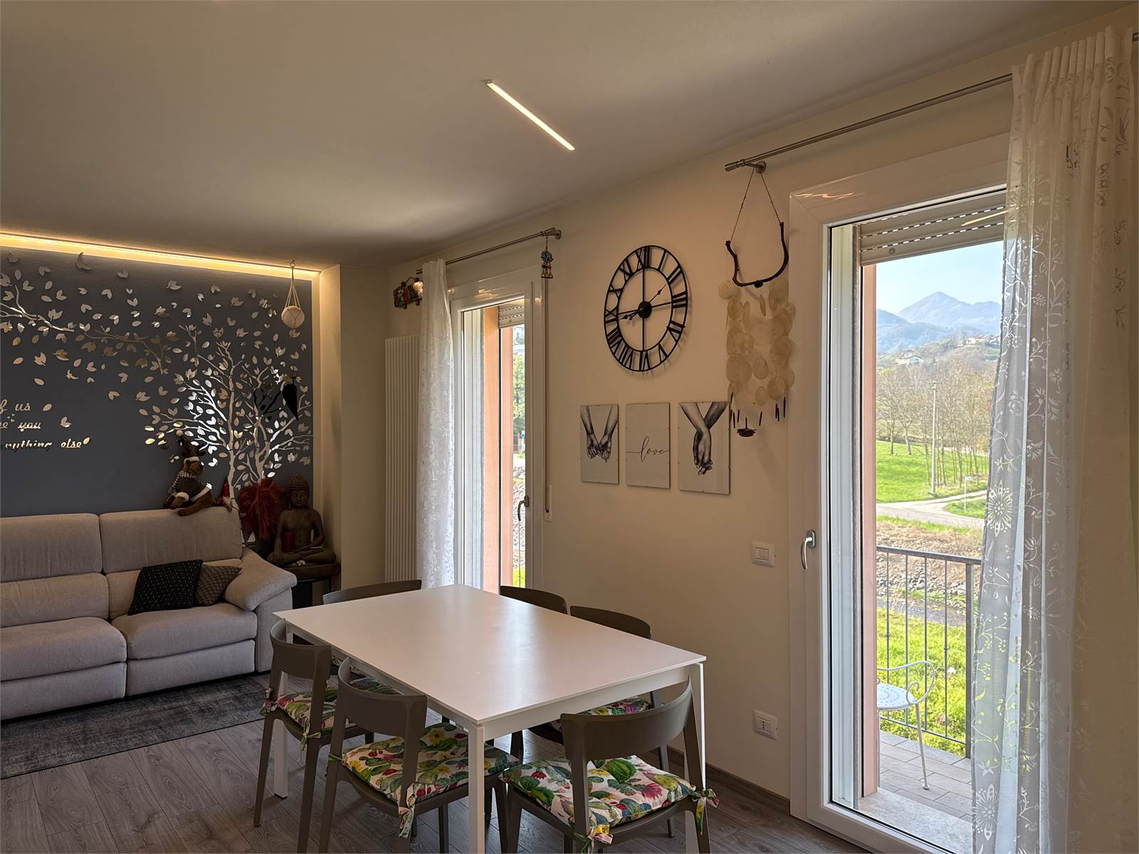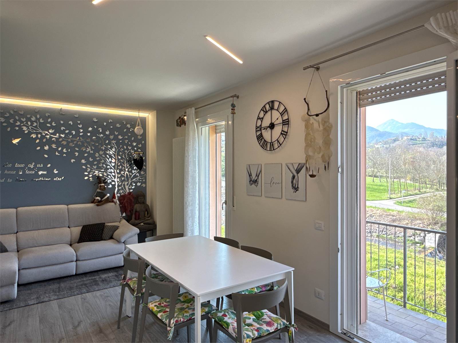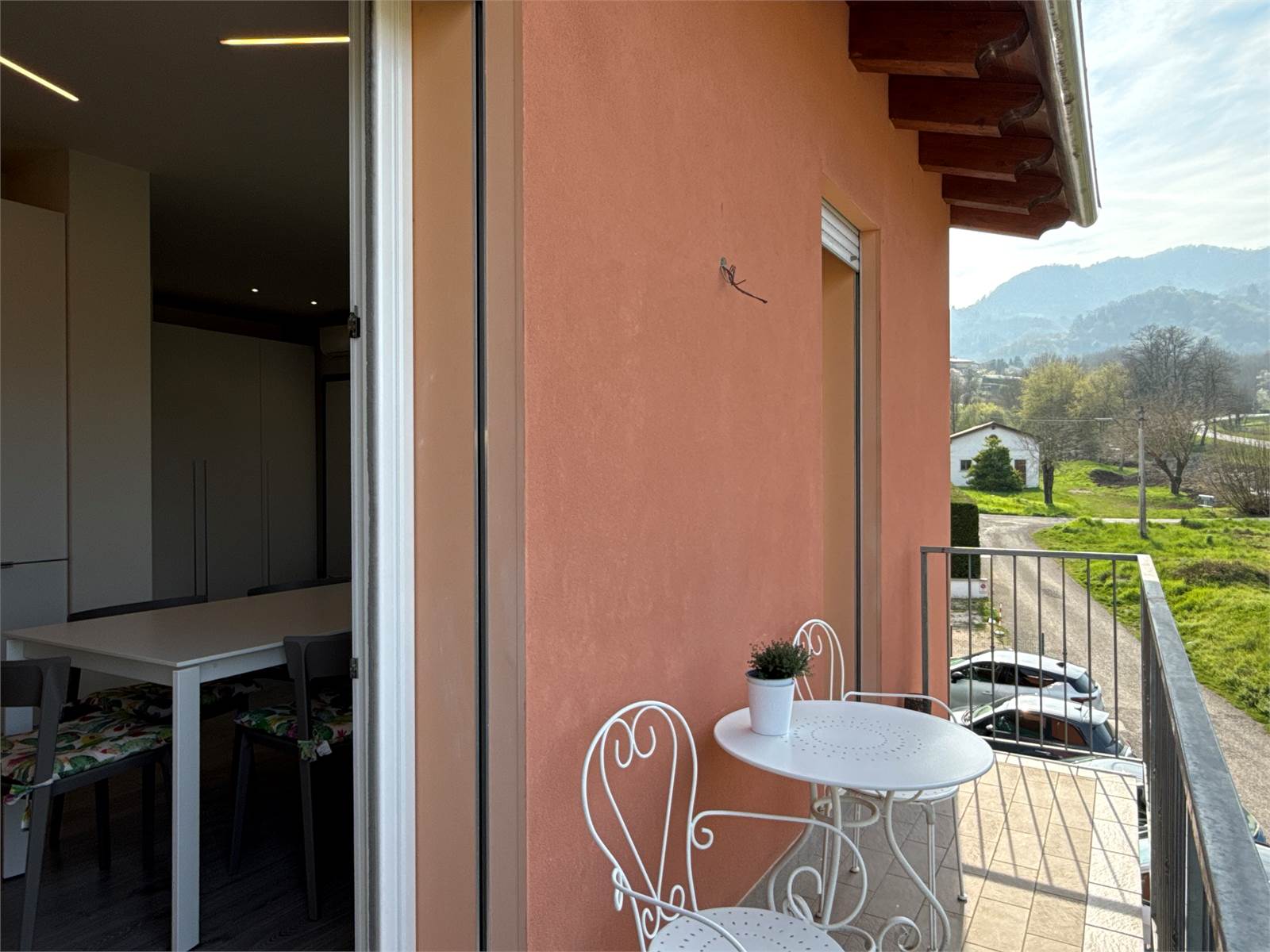 Dal soggiorno, attraverso due porte finestre, si accede a un piacevole terrazzo panoramico con vista sulle montagne, ideale per momenti di relax all’aperto.