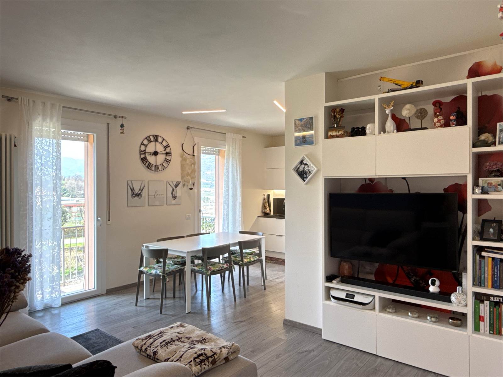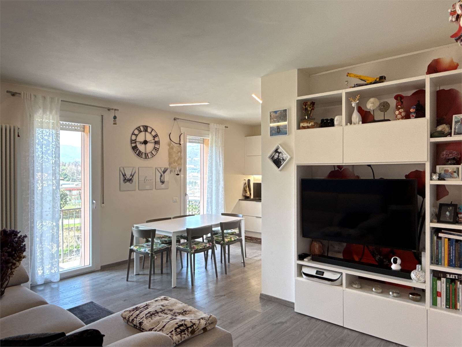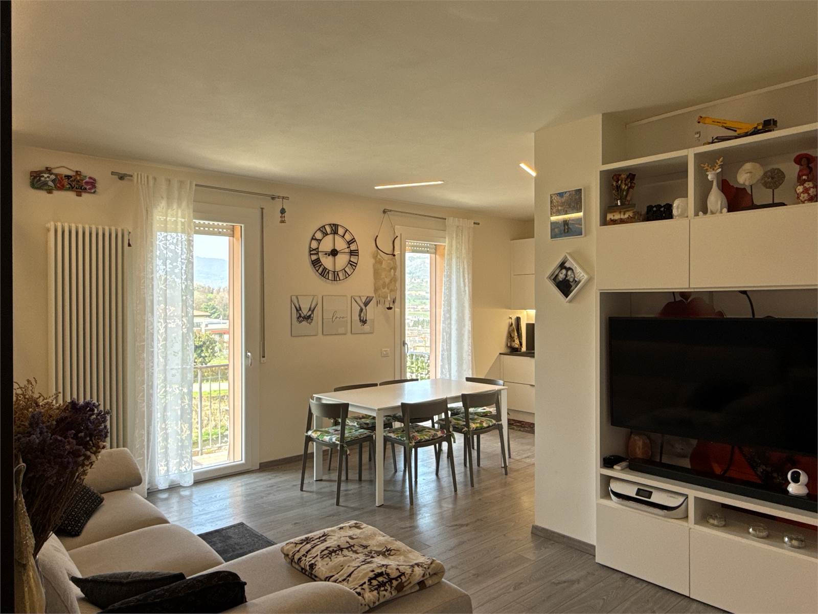 Dal soggiorno, attraverso due porte finestre, si accede a un piacevole terrazzo panoramico con vista sulle montagne, ideale per momenti di relax all’aperto.