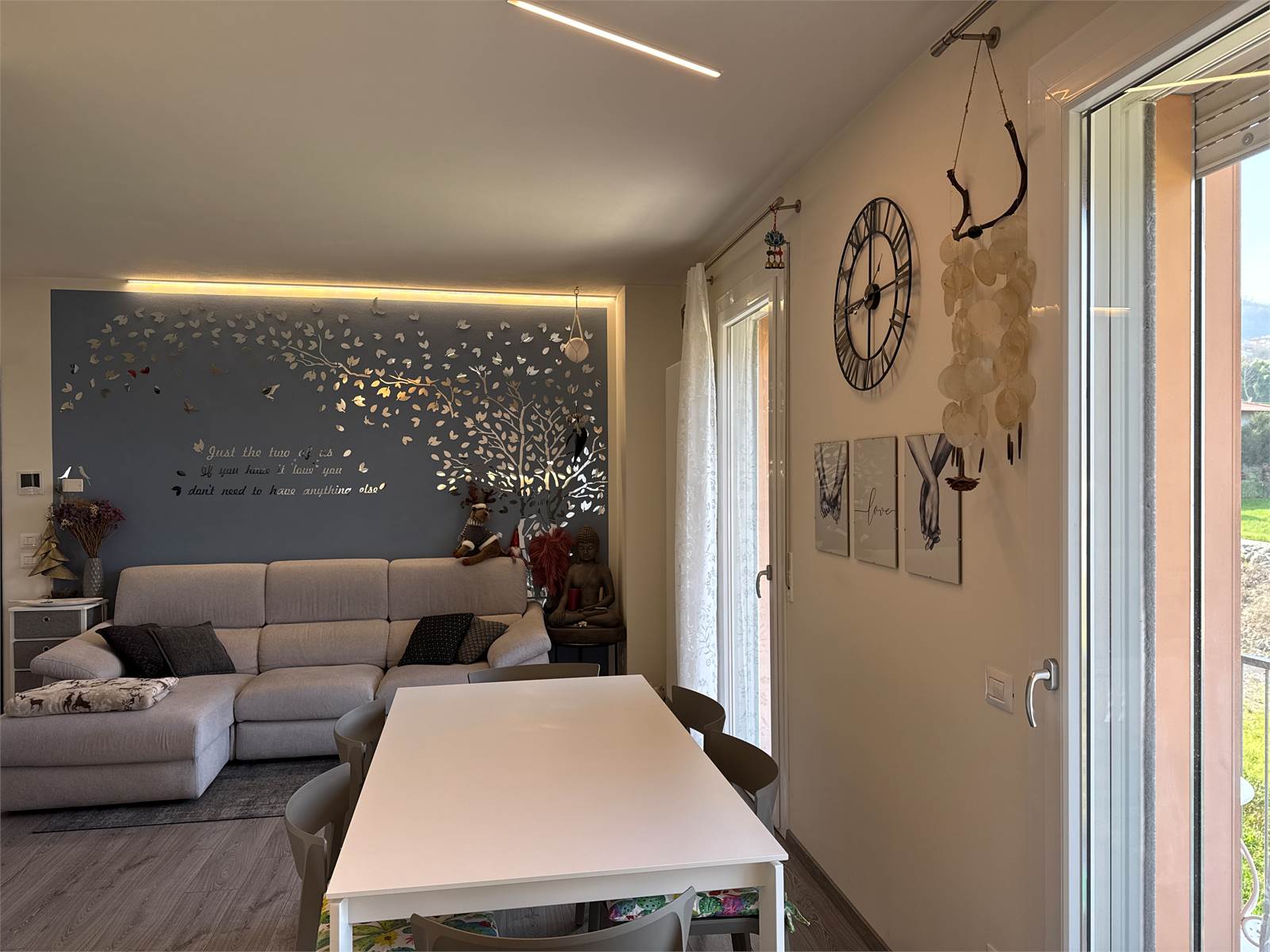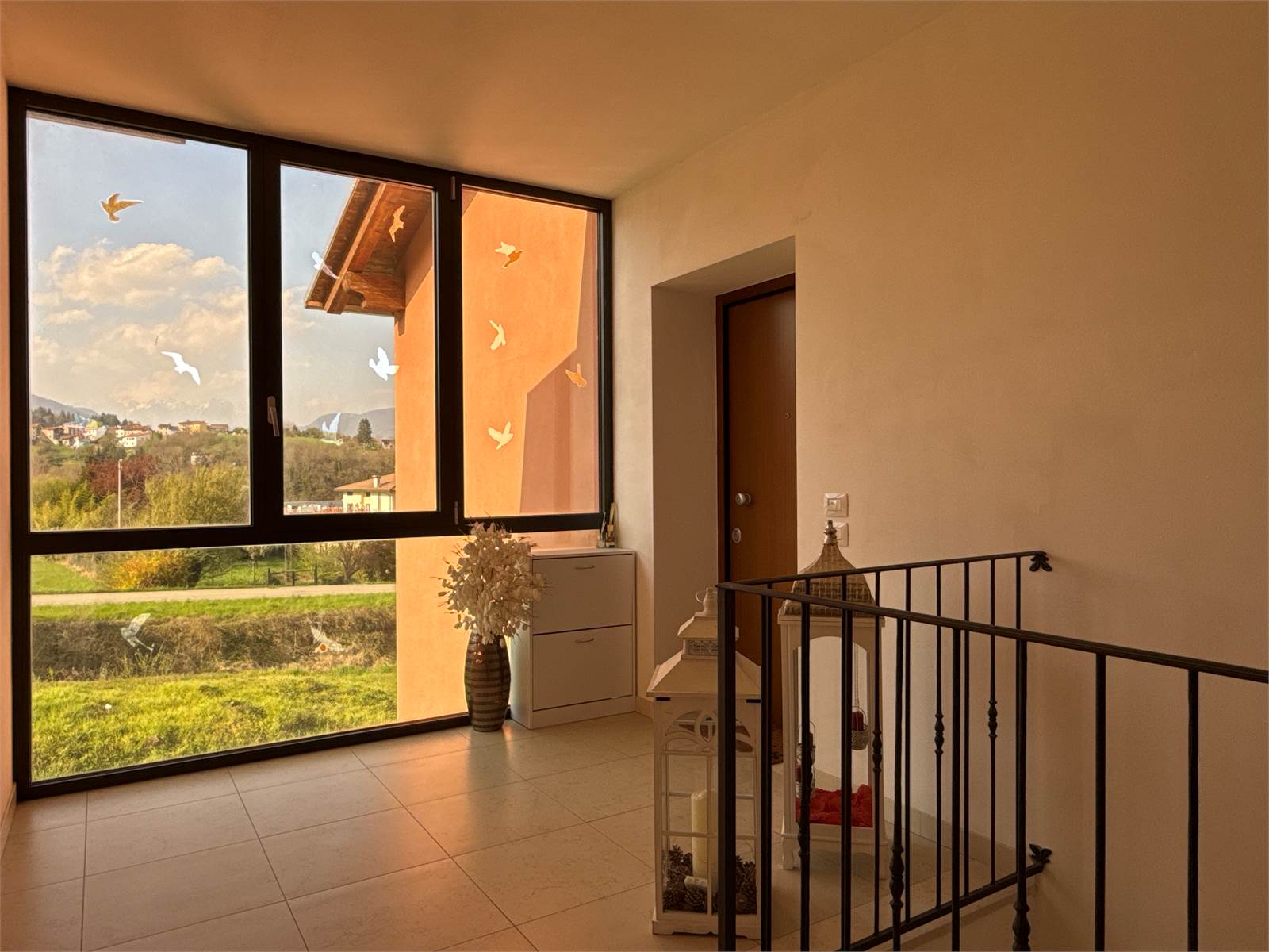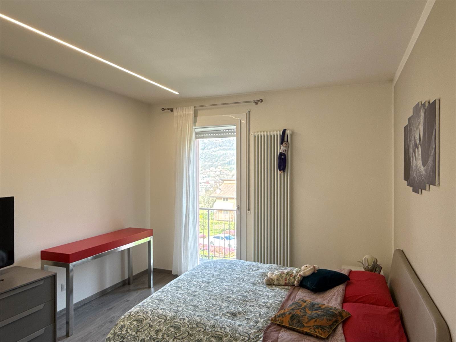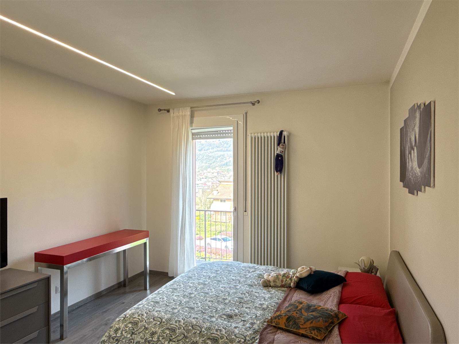 Dal soggiorno, attraverso due porte finestre, si accede a un piacevole terrazzo panoramico con vista sulle montagne, ideale per momenti di relax all’aperto.