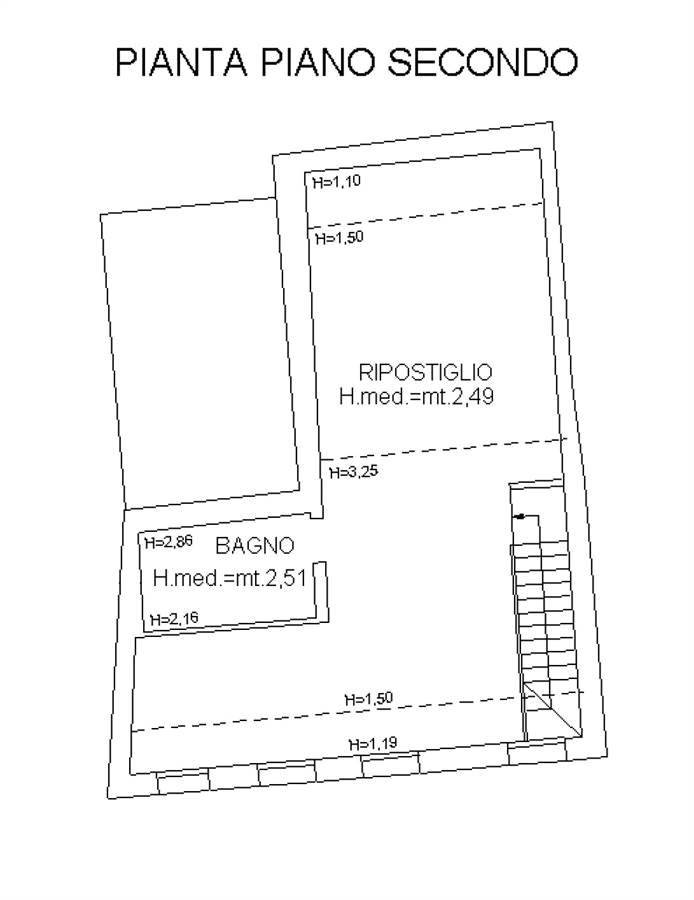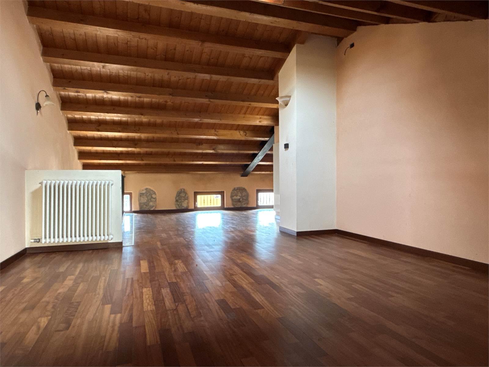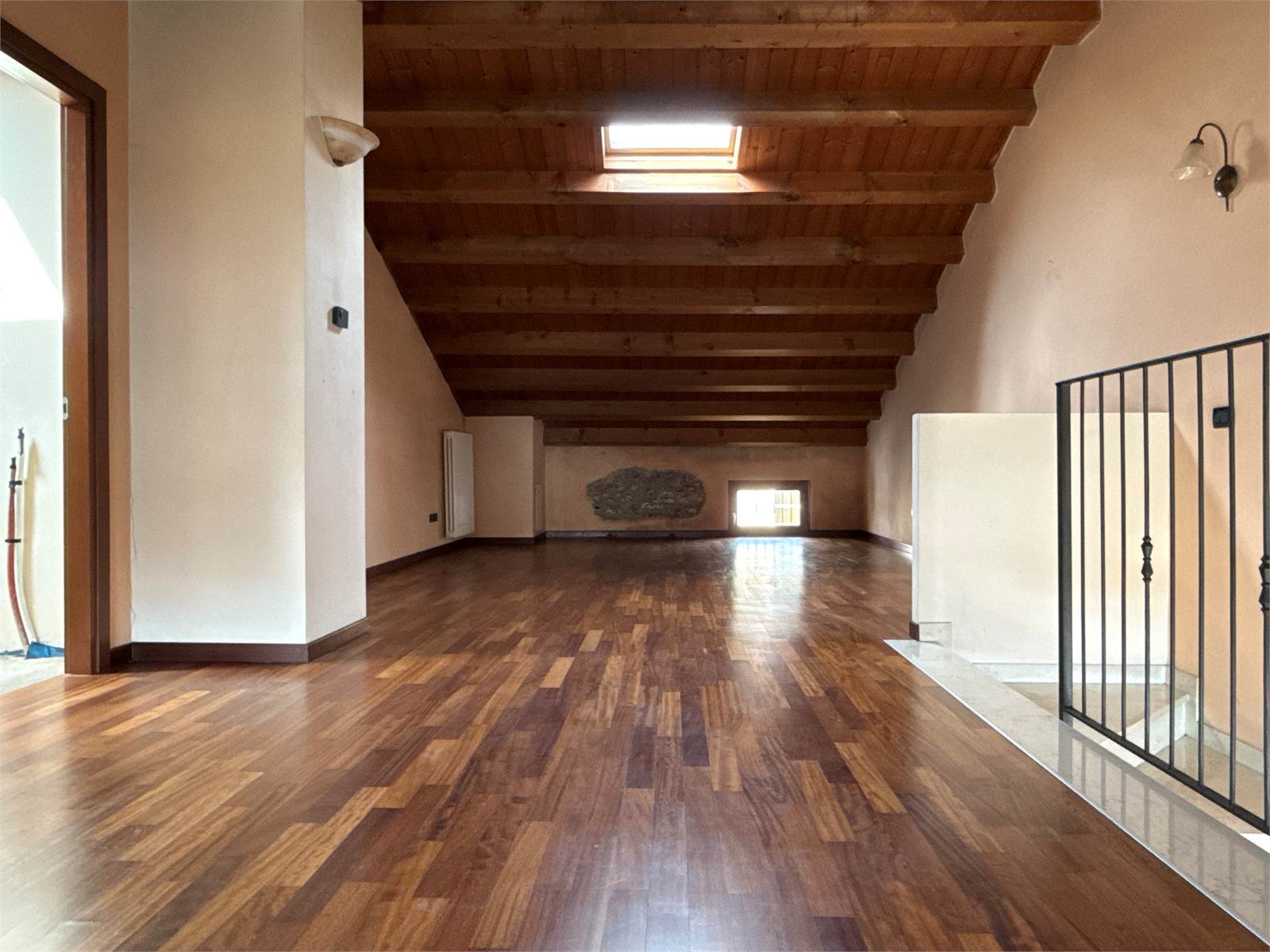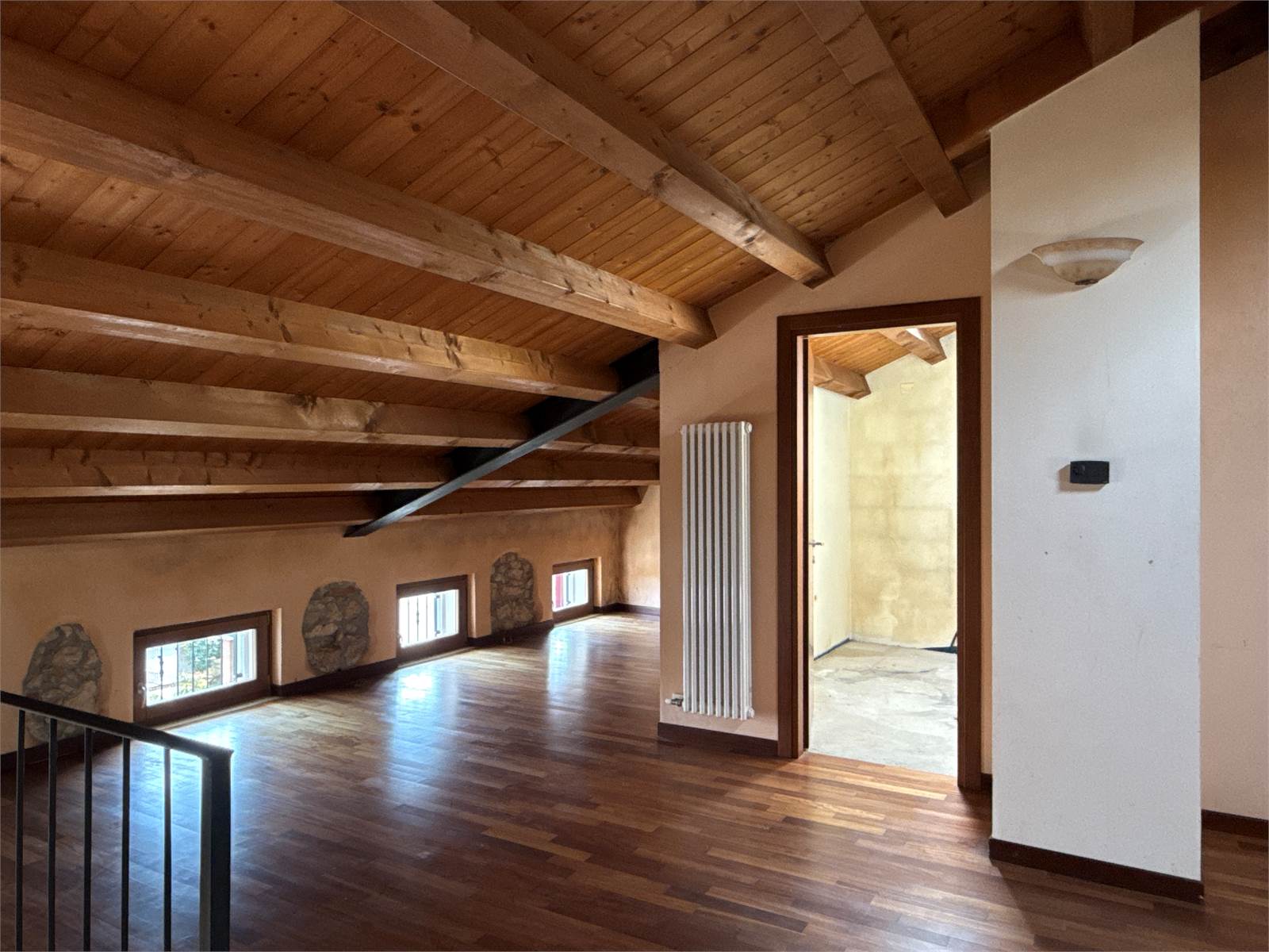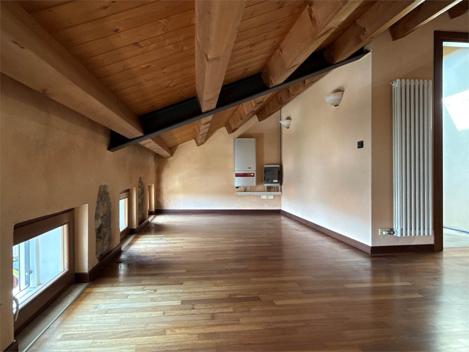 Il piano secondo sottotetto ospita un ampio ambiente open space con tetto in andamento e travi a vista in legno; la porzione fruibile con altezze adeguate misura circa 30 mq. È inoltre presente un vano al grezzo già predisposto con gli scarichi per la realizzazione di un ulteriore bagno.